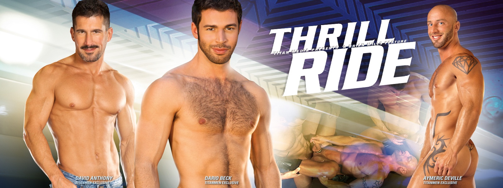Wanna ride? Hop on board, strap yourself in and hold on tight for a hard and fast drive down to Dirty Town. Shift into high gear as TitanMen exclusives David Anthony, Dario Beck, Aymeric DeVille and Philippe Ferro hit it hard, going full throttle as they masterfully work their sticks in a Thrill Ride you won't soon forget. Supervisor David Anthony joins Philippe Ferro in training new employee Aymeric DeVille, who does some dirty work his first day on the job. Muscle studs Jason Diaz and Logan Scott lock and load their pistols by the pool, getting wet as they shoot on each other with their weapons. Hunky driver Dirk Caber spots stranger Dario Beck by the road, the two soon engaged in an outdoor flip-fuck that has the breathless buds soaked in sweat.
