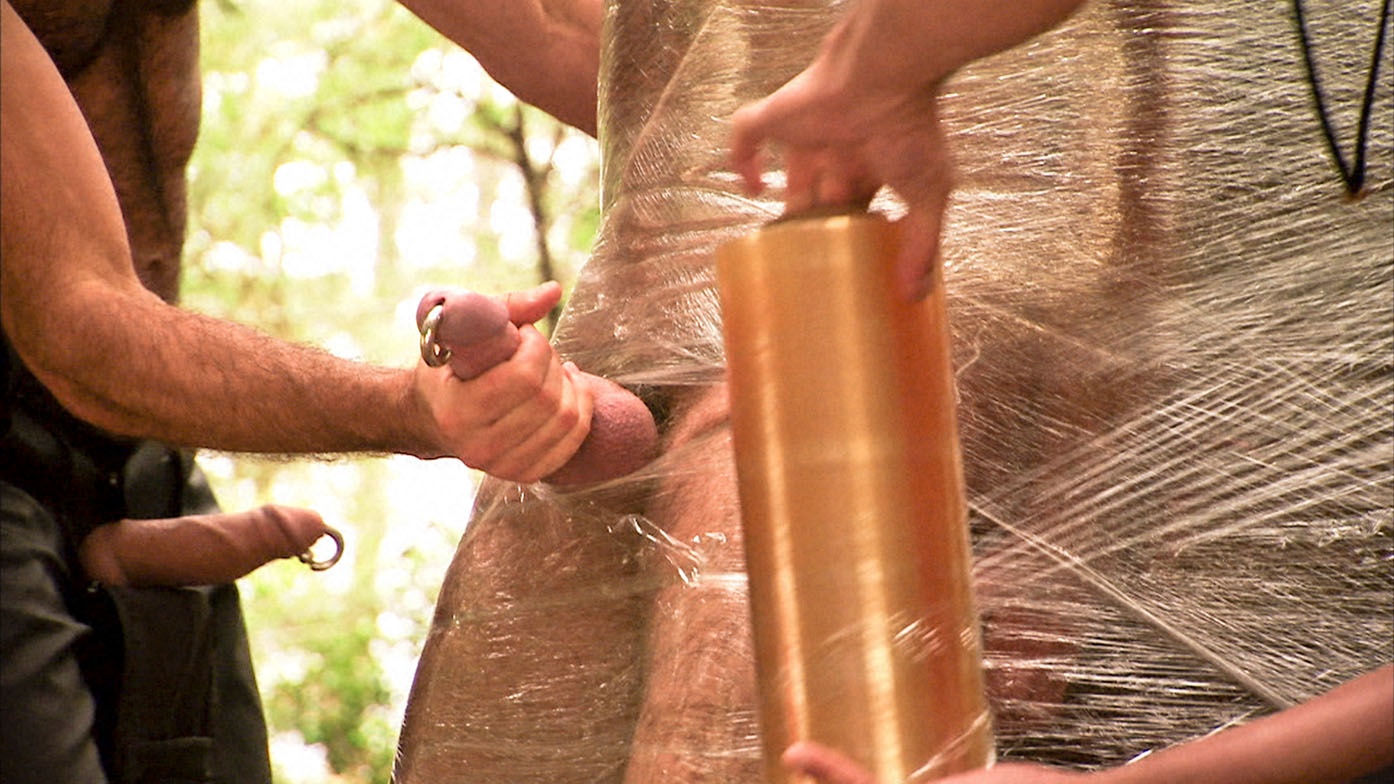 | Lured to a tree in the forest by shaved-headed hottie Billy Duro, hairy muscle stud Trey Walker strips down with his bud as the two kiss. Their two meaty, pierced cocks soon throb out of their leather chaps, and Duro drops down to feast on his bud’s big bulge after pulling on his engorged, pierced nipples. Duro smacks Walker’s balls before tying him to a tree, making him helpless to the continued nipple, stomach, cock and ball torture—action alternated with satisfyingly deep sucks on Walker’s big meat. Tony Buff briefly joins the duo to help Duro secure Walker to the tree using cling wrap, mummifying the stud from neck to ankle. Small holes are cut to give Walker’s cock and nipples a release while opening them to more of Duro’s abuse. The tormenter pulls on Walker’s giant nipples and balls, beats on his stomach and spits on his face before binding their cocks together by their Prince Alberts in a hot shot. Duro then breaks out clamps and clothespins to use on Walker’s nipples and sack (“Thank you, sir!”) before mercifully releasing his captive. Walker is then tied to two tree stumps and bent over for a hot fuck from behind, ending when Duro’s big wad lands...SCENE # 3 | |